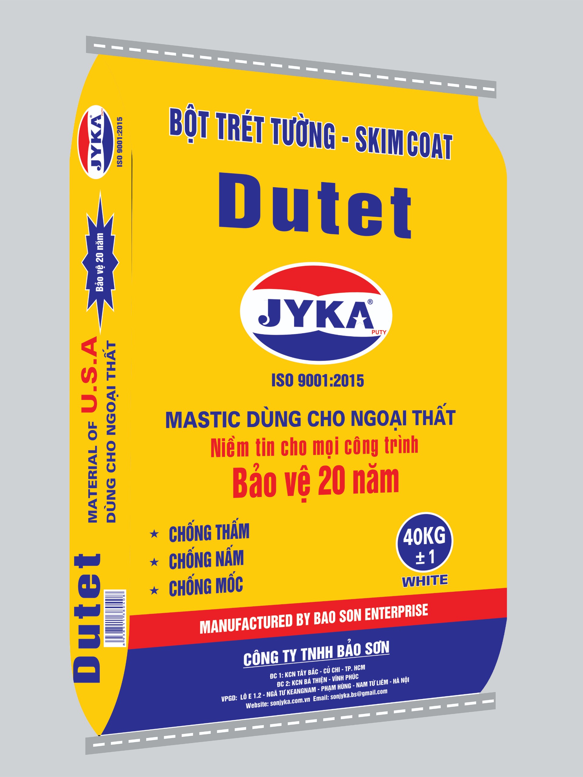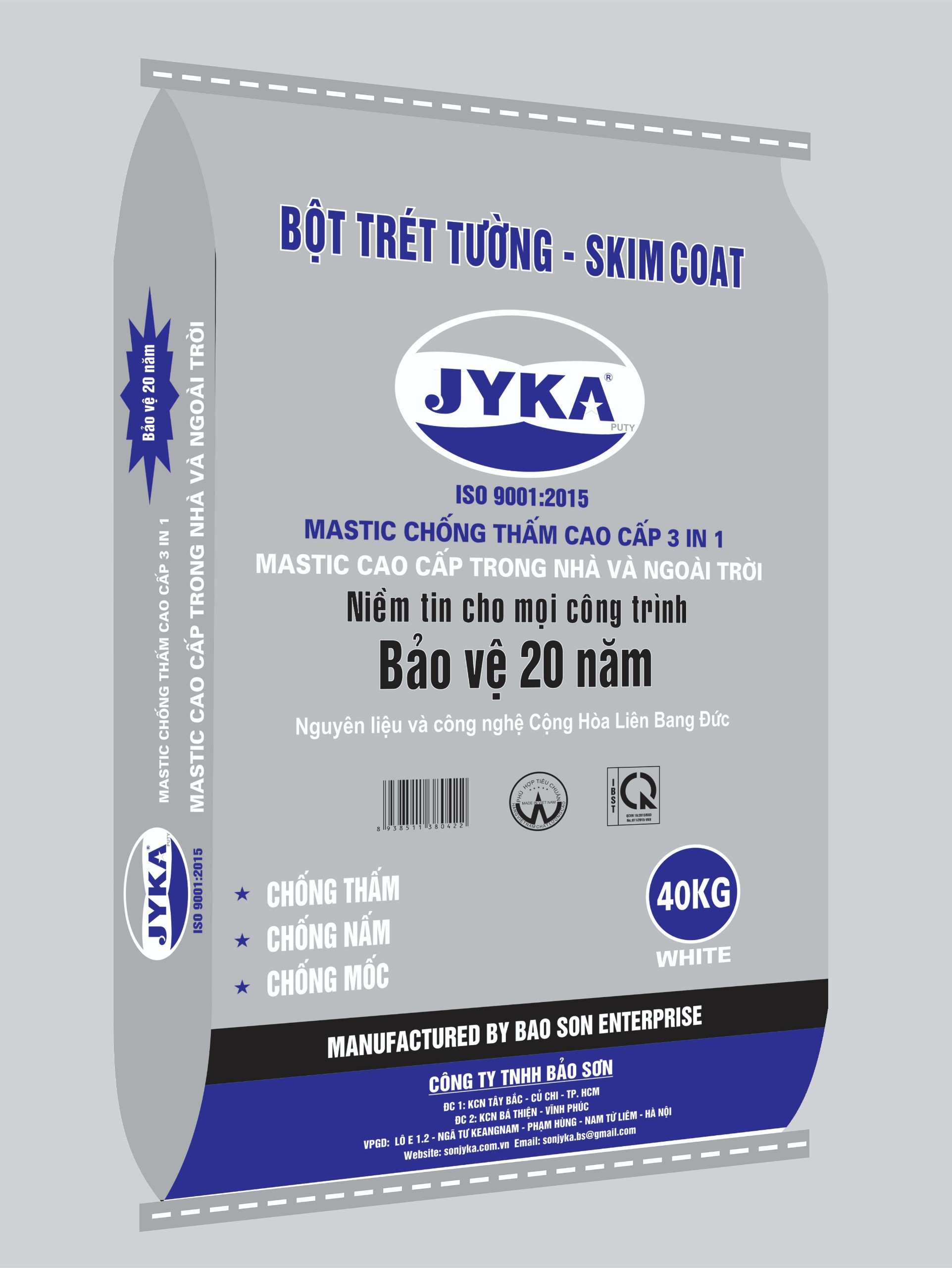 BỘT TRÉT JYKA CAO CẤP CHỐNG THẤM 3IN1 là bột trét cao cấp trong nhà được đặc chế để sử dụng làm phẳng các bề mặt trước khi sơn. bôt trét giúp các lớp sơn hoàn thiện dẹp hơn.thích hợp cho các bề mặt hồ vữa,xi măng…