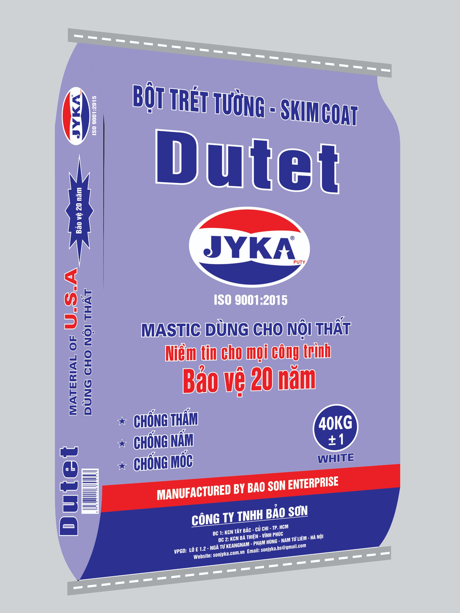 JYKA DUTET là bột trét trong nhà được đặc chế để sử dụng làm phẳng,mịn bề mặt trước khi sơn.bôt trét giúp các lớp sơn hoàn thiện dẹp hơn.thích hợp cho các bề mặt hồ vữa,xi măng…
