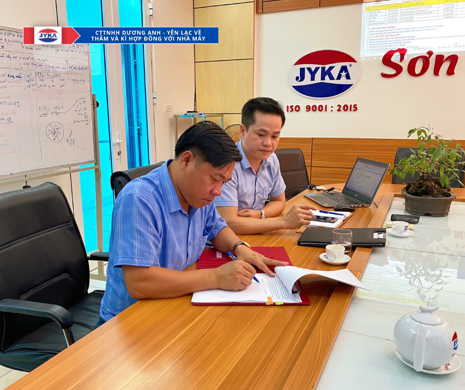 Cũng tại buổi làm việc này, Công ty TNHH DƯƠNG ANH đã ký kết hợp đồng trở thành nhà phân phối sơn Jyka. Giám đốc Dương Văn Thỏa bày tỏ sự vui mừng khi cả hai bên thống nhất đạt được những thỏa thuận. Từ đây, Công ty TNHH DƯƠNG ANH chính thức trở thành đối tác kinh doanh của chúng tôi.